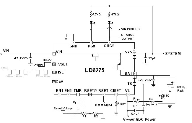 為滿足低耗電可攜式產(chǎn)品對于更精確、更安全的充電器應(yīng)用需求,許多IC制造商發(fā)展出低成本線性充電器。圖2是以通嘉科技的LD6275充電IC為設(shè)計范例,構(gòu)成僅需少數(shù)外部零件的獨立式線性充電器電路,其具備1.5A的最大充電電流。