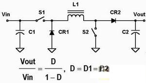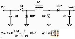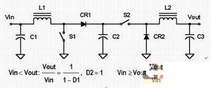 圖1a的電路盡管是四個(gè)電路中最復(fù)雜的,卻有幾個(gè)優(yōu)點(diǎn)。它的輸入和輸出電流被電感平滑處理,減小了輸入和輸出端的紋波電流以及對(duì)電容C1和C3的電流應(yīng)力。但是這一方案也有缺點(diǎn),電容C2的電流不管是當(dāng)Vin小于Vout時(shí)來(lái)自CR1還是當(dāng)Vin大于Vout來(lái)自S2,它都會(huì)有中斷,而且它需要兩個(gè)電感。
