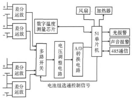 具有高電壓、高容量、循環(huán)壽命長、安全性能好等優(yōu)點的鋰離子電池,在便攜式電子設(shè)備、電動汽車、空間技術(shù)、國防工業(yè)等多方面具有廣闊的應(yīng)用前景。由若干節(jié)鋰離子電池經(jīng)串聯(lián)組成的動力鋰離子電池組目前應(yīng)用最為廣泛。由于每節(jié)單體電池的電壓不一致,使用中電池不允許過充電、過放電,電池的性能和壽命受溫度影響較大等特點,必須對串聯(lián)鋰離子電池組進(jìn)行監(jiān)測,確保在使用中鋰離子電池具有良好的狀態(tài),或者使用中電池出現(xiàn)問題立即報警,電源管理系統(tǒng)立即采取保障措施,并提醒相關(guān)人員檢修。單體電壓和電池組的溫度是辨別串聯(lián)鋰離子電池組是否正常工作的主要技術(shù)指標(biāo)。采用直接采樣法,將要測量的單體電池電壓存儲在非電容上進(jìn)行測量。該方法反應(yīng)時間慢、誤差較大、控制復(fù)雜; 采用運(yùn)放和光藕繼電器來測量串聯(lián)電池組的單體電壓。該方法對光耦的線性度要求很高,導(dǎo)致硬件成本較高。目前,直接采用集成芯片的串聯(lián)鋰離子電池組監(jiān)控系統(tǒng)受到青睞,但該方法串聯(lián)電池的數(shù)目固定,導(dǎo)致應(yīng)用不靈活、硬件成本高等缺點。文中研制了一種動力鋰離子電池組監(jiān)測系統(tǒng),對串聯(lián)鋰離子電池組的單體電壓和電池組的溫度進(jìn)行在線監(jiān)測,當(dāng)單體電池電壓偏離規(guī)定區(qū)間時,監(jiān)測系統(tǒng)啟動報警程序進(jìn)行聲、光報警; 當(dāng)電池組溫度偏離規(guī)定的區(qū)間時,監(jiān)測系統(tǒng)啟動風(fēng)扇或加熱控制電路,并存儲有關(guān)數(shù)據(jù),確保電池組正常工作。整個監(jiān)測系統(tǒng)具有連續(xù)測量分量、簡單經(jīng)濟(jì)、精度高和可靠性高的特點。