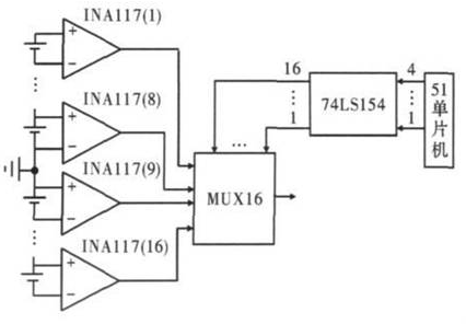 每節(jié)鋰離子電池最高電壓為5 V,由圖3 可得,第1 個INA117 的3 腳的輸入電勢最高為40 V.同理,第16 個INA117 的2 腳輸入電勢最低為- 40 V.第1 至8 個INA117 的輸出電壓為正,第9 至16 個INA117 的輸出電壓為負(fù),所以多選一模擬開關(guān)和A/D 轉(zhuǎn)換器都要求可以輸入正、負(fù)電壓。多選一模擬開關(guān)選用MUX16,為16 選1 可正負(fù)電壓輸入模擬開關(guān),因此16節(jié)電池只需1 個MUX16.但由于單片機(jī)IO 口有限,文中用一片74LS154 擴(kuò)展了IO 口,僅用單片機(jī)的4 個IO 口即可控制MUX16 分別選通單節(jié)鋰離子電池進(jìn)行電壓采樣。
