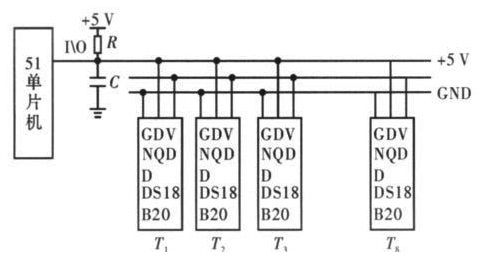 針對串聯(lián)電池組,傳統(tǒng)的測溫方法多采用模擬溫度傳感器進(jìn)行測量,在數(shù)據(jù)的采集和傳輸過程中易受外界環(huán)境的干擾,從而使測得的結(jié)果誤差較大,且當(dāng)測量點較多時,連線較復(fù)雜。文中采用單片機(jī)和單總線數(shù)字式溫度傳感器DS18B20 來解決上述問題。其原理如圖5 所示。