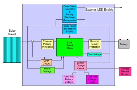 設計工作包括根據(jù)功率需求的增加隔離拓撲結構。電池充電狀態(tài)的管理是由適當?shù)某潆娝惴ㄍ瓿傻摹L柲茈姵匕灏惭b技師可以選擇輸出電壓和電池充電速率。由于控制器要連接到太陽能電池板,它必須具有最大功率點跟蹤,為最終客戶提供高價值??刂破饔袃蓚€正使能(Enable)電路,一個電路檢測黑夜時間,另一個檢測電池的充電狀態(tài),使外部電路不會使電池對損壞點放電。由于控制器將由不同程度經(jīng)驗的現(xiàn)場技術人員和新手安裝,因此重要的是輸入和輸出必須有反向極性保護。另外,控制器和電池可能安裝在過熱或過冷的位置,控制器必須采用電池充電溫度補償。設計還應包括安全功能,如電池過壓檢測和太陽能電池板欠壓檢測。