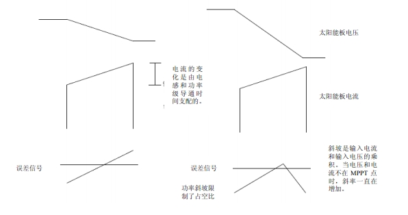 為了從功率可變的電源(即太陽能電池板)析取出最大的功率,太陽能控制器必須采用 MPPT。MPPT 必須首先找到最大功率點并及時調整環(huán)境條件,以保持控制器接近最大功率點。動態(tài) MPPT 用在系統(tǒng)發(fā)生改變的情況下。由于每個開關周期都在發(fā)生變化,太陽能電池板汲取的功率也會在每個周期有明顯的改變。動態(tài)MPPT利用太陽能電池板的電壓驟降乘以每個開關周期增加的電流,以確定將要產(chǎn)生的誤差信號來調節(jié)占空比。動態(tài)響應可檢測 IV 曲線的斜率,從而建立一個功率斜坡,從誤差信號相交點建立一個代表占空比的功率。當斜坡變化斜率從正到負時該周期結束,如圖 2 所示。