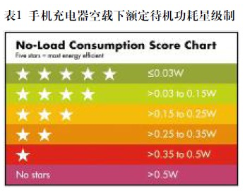 這些關(guān)注的結(jié)果是采取一系列措施來提升效率和降低空載功耗的需求。其中最新最嚴(yán)格的是由全球前五大手機(jī)廠商提出的一項(xiàng)自愿性的充電器星級制協(xié)定,用以標(biāo)志在充電完成之后,充電器仍插在壁式插座上時(shí)的耗能量。該星級制從0星級開始,最高5星級。空載下額定待機(jī)功耗大于0.5W的充電器為0星級標(biāo)簽,待機(jī)功耗小于0.03W(30mW)的為5星級(見表1)。通過比較,大多數(shù)現(xiàn)有手機(jī)的待機(jī)功耗在150~300mW范圍。