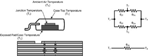 現(xiàn)在來快速了解一下如何進(jìn)行不含散熱片的簡單PCB散熱設(shè)計(jì),圖3示意了模塊及作為熱阻抗的PCB。與從結(jié)到裸片焊盤的熱阻抗相比,由于結(jié)與外封裝頂部間的熱阻抗相對較高,因此在第一次估計(jì)從結(jié)到周圍空氣的熱阻(θJT)時(shí),我們可以忽略θJA散熱路徑。