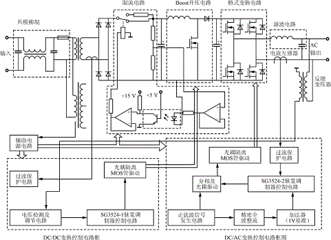 圖1示出了系統主電路和控制電路框圖。交流輸入電壓經過共模抑制環(huán)節(jié)后,再經工頻變壓器降壓,然后整流得到一個直流電壓,此電壓經過Boost電路進行升壓,在直流環(huán)上得到一個符合要求的直流電壓350V(50Hz/220V交流輸出時)。DC/AC變換采用全橋變換電路。為保證系統可靠運行,防止主電路對控制電路的干擾,采用主、控電路完全隔離的方法,即驅動信號用光耦隔離,反饋信號用變壓器隔離,輔助電源用變壓器隔離。過流保護電路采用電流互感器作為電流檢測元件,其具有足夠快的響應速度,能夠在MOS管允許的過流時間內將其關斷。