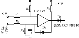 過流保護是利用SG3524的腳10加高電平封鎖脈沖輸出的功能。當腳10為高電平時,SG3524的腳11及腳14上輸出的脈寬調制脈沖就會立即消失而成為零。過流信號取自電流互感器(對SG3524-1芯片串接在工頻變壓器的副邊,對SG3524-2芯片串接在濾波電路前),經整流后得到電流信號加至如圖6所示過流保護電路上。過流信號加至電壓比較器LM339的同相端。當過流信號使同相端電平比反相端參考電平高時,比較器將輸出高電平,則二極管D2將從原來的反向偏置狀態(tài)轉變?yōu)檎驅?,并把同相端電位提升為高電平,這一變化將使得電壓比較器一直穩(wěn)定輸出高電平封鎖脈沖,則Boost電路停止工作,在正常狀態(tài)下,比較器輸出零電平,不影響B(tài)oost電路工作。