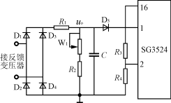 反饋調壓電路圖如圖7所示。當逆變器正常工作時,逆變器的輸出信號接反饋變壓器,其二次電壓經整流,濾波,分壓得到反饋電壓uo,顯然,uo的大小正比于逆變器的輸出電壓。調節(jié)W1可調節(jié)負反饋電壓的大小,從而調節(jié)逆變器輸出電壓的幅值。uo控制信號被送到SG3524-1芯片的誤差放大器的反相端腳1。誤差放大器的同相端腳2接參考電平。這樣,SG3524的輸出脈沖的占空比就受到反饋信號的控制。調節(jié)過程是這樣的,當逆變器輸出因突加負載而降低時,它會使加在SG3524-1的腳1的輸入反饋電壓下降,這會導致SG3524-1輸出脈沖占空比增加,從而使得Boost電路輸出電壓升高,逆變橋的直流電壓升高,逆變器輸出交流電壓升高。反之亦然??梢?,正是通過SG3524-1的脈寬調制組件的控制作用,實現了整個逆變器的輸出自動穩(wěn)壓調節(jié)功能。