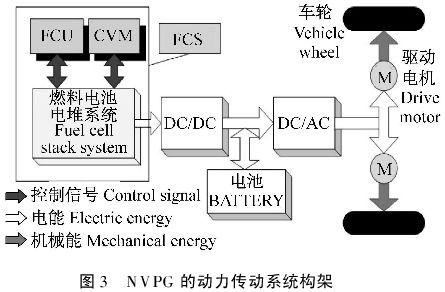另一種構(gòu)架是并聯(lián)式的燃料電池混合動力系統(tǒng)的結(jié)構(gòu)。這種構(gòu)建通常在燃料電池和電機控制器之間安裝了一個DC/DC變換器,燃料電池的端電壓通過DC/DC變換器的升壓或降壓來與系統(tǒng)直流母線的電壓等級進行匹配。這種系統(tǒng)與上述構(gòu)架不同之處還在于,這種動力系統(tǒng)的設(shè)計沒有考慮能量的回饋回收,因此系統(tǒng)雖然簡單,但效率比較低下。