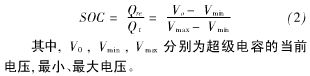 如果僅采用超級電容作為唯一輔助能源還存在諸多不足之處,如:電動汽車長時間停機后再次啟動,由于超級電容的自放電效應(yīng),在燃料電池的能量輸出尚未穩(wěn)定時車載輔助系統(tǒng)的供電將無法保障。況且超級電容能量密度很低,若要達到一定的能量儲備能力其設(shè)備體積勢必加大。當前超級電容都是與其他動力電池一起購車輔助電源系統(tǒng),在燃料電池汽車上使用的。為了克服精確的描述超級電容的特性,可以采用阻抗法進行建模代替簡單RC回路模型。超級電容當前SOC主要基于超級電容的輸出電壓: