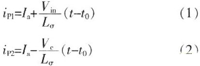 (2)工作模態(tài)2[t0-t2] 如圖3(b)所示,t1時刻,D2、D3中反向恢復(fù)電流達(dá)到最大值,D5、D6導(dǎo)通,D2、D3達(dá)到瞬時反向電壓Vo,緩沖電容C1(C2)和副邊漏感Lo’開始諧振。Vin、VC分別加在原邊繞組Np1、Np2上,ip1正向增大,ip2減小并反向增大。