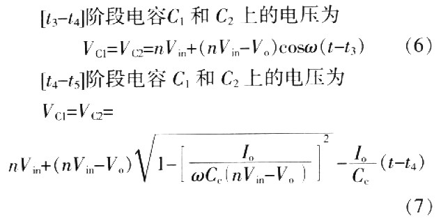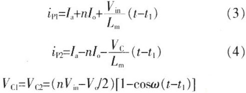兩端電壓從零開始諧振增大,在半個諧振周期后達(dá)到最大值VC1max=VC2max=2nVin-Vo,此時模態(tài)2結(jié)束。模態(tài)2中,VD5=VD6=0,VD7=Vo。二極管D2、D3兩端反向電壓從V0逐漸增大VD2=VD3=4nVin-V0。