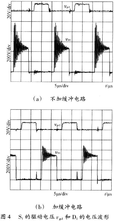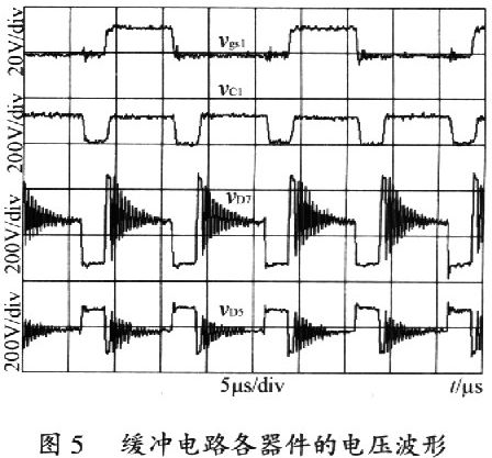 圖5給出了緩沖電路各器件的電壓波形,波形從上往下依次是vgsl、vC1、vD7、vD5。當(dāng)任何一個開關(guān)管開通時,緩沖電容充電,抑制了關(guān)斷整流管的電壓尖峰;當(dāng)任何一個開關(guān)管關(guān)斷時,緩沖電容給負(fù)載釋放能量,然后4個整流二極管均導(dǎo)通續(xù)流。整流二極管和緩沖二極管上振蕩周期均為
