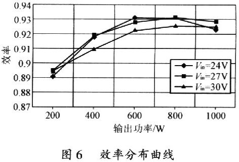 圖6為該變換器在24V、27V、30V輸入時對應(yīng)不同輸出功率的的效率分布曲線圖。其中輸入電壓為24V,輸出功率600W時最高效率可達(dá)93.1%,27V滿載1 000W時效率為92.8%。