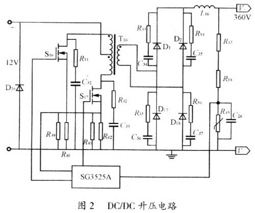 其工作原理為將升壓變壓器的中心抽頭接于正電源,兩路相反的PWM驅動脈沖送至開關管S16、S17的基極,從而控制兩只功率管交替工作,得到的方波交流電壓經(jīng)變壓器輸出,經(jīng)電感L16和電容濾波得到360V直流。電流檢測電阻(R41//R42)得到的電壓接到SG3525A的腳10來實現(xiàn)過流保護。R37、R38和R45為電壓采樣,構成電壓負反饋,因而提高了電路的可靠性。SG3525A及控制電路的電源都來自蓄電池,D16為防反接二極管。DC/DC從12V蓄電池電壓升到360V直流電,供后級鎮(zhèn)流電路點燈。