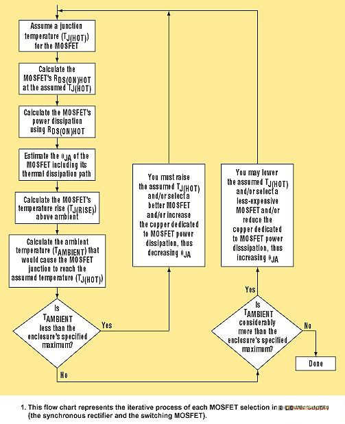 再參考圖1說(shuō)明,確定是否正確選擇了用于同步整流器和開(kāi)關(guān)MOSFET的MOSFET迭代過(guò)程的下一個(gè)步驟。這一步驟計(jì)算每個(gè)MOSFET的環(huán)境空氣溫度,它可能導(dǎo)致達(dá)到假設(shè)的MOSFET結(jié)溫。為此,首先要確定每個(gè)MOSFET的結(jié)與環(huán)境間的熱阻(ΘJA)。