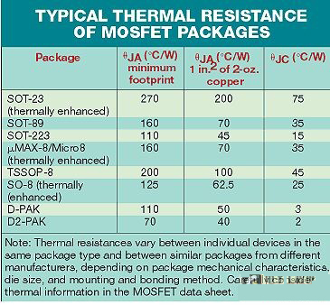 例如,采用1平方英寸的銅片,D-Pak的ΘJAD-Pak可能是50°C/W。但如果銅片就設(shè)在封裝引腳下,ΘJA值將會(huì)加倍(參見(jiàn)表)。采用多個(gè)并聯(lián)MOSFET,ΘJA主要依賴(lài)于它所安裝的銅片面積。兩個(gè)元器件的等效ΘJA可能是只有一個(gè)元器件時(shí)的一半,除非銅片的面積加倍。就是說(shuō),增加并聯(lián)MOSFET而不同時(shí)增加銅片面積,將使RDS(ON)減半,但對(duì)ΘJA的改變小得多。