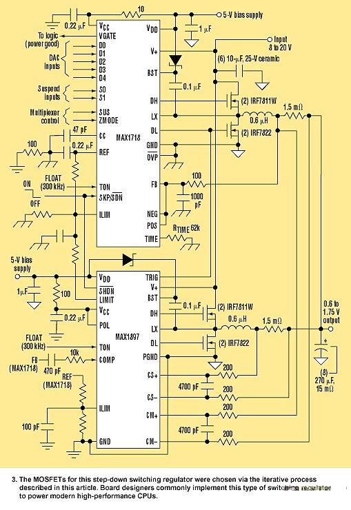 在室溫下組合的最大RDS(ON)為6mΩ,在115°C(假設(shè)的TJ(HOT))為8.7mΩ的兩個(gè)并聯(lián)IRF7811WMOSFET組成開(kāi)關(guān)MOSFET。組合CRSS為240pF。MAX1718以及MAX1897的1Ω柵極驅(qū)動(dòng)輸出約為2A.。當(dāng)VIN=8V時(shí),電阻損耗為0.57W,而開(kāi)關(guān)損耗約為0.05W。在20V時(shí),電阻損耗為0.23W,而開(kāi)關(guān)損耗約為0.29W。在每個(gè)操作點(diǎn)的總損耗大體平衡,而在最小VIN處的最壞情況下,等于0.61W。