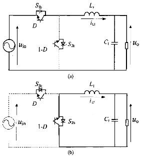 當(dāng)開關(guān)管S1b開通、S2b關(guān)斷時(shí),輸入電壓通過(guò)開關(guān)管S1b、電感Lf給電容Cf和負(fù)載供電,如圖4(a)所示;當(dāng)開關(guān)管S1b斷開,S2b開通時(shí),電感電流iLf經(jīng)Lf、開關(guān)管S2b的反向二極管、Cf和負(fù)載續(xù)流,Lf和Cf共同向負(fù)載供電,如圖4(b)所示。