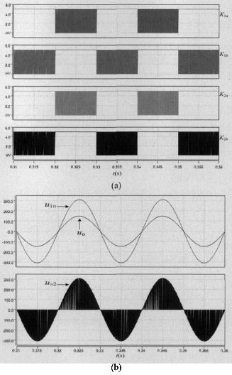 開關(guān)管S1a、S1b、S2a、S2b的控制信號(hào)K1a、K1b、K2a、K2b的仿真波形如圖7(a)所示。當(dāng)輸入電壓大于零時(shí),開關(guān)管S1b、S2b恒通,S1a、S2a高頻互補(bǔ)開通;當(dāng)輸入電壓小于零時(shí),開關(guān)管S1a、S2a恒通,S1b、S2b高頻互補(bǔ)開通。圖7(b)為輸入電壓uin、輸出電壓uo和交流開關(guān)管S2的兩端(即S2a、S2b兩管D(漏極)-D(漏極)之間的)電壓波形uS2。