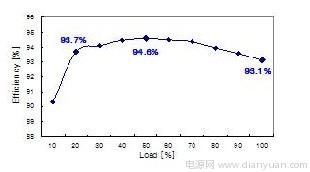 轉(zhuǎn)換器的效率如圖 7 所示,在額定負(fù)載為 20%、50% 和 100% 的情況下測(cè)得的效率分別為93.7%、94.6% 和 93.1%,這顯示了邊際性能,因而使用設(shè)計(jì)優(yōu)良的 PFC 和 DC-DC 級(jí)能夠達(dá)到85 PLUS 規(guī)范要求。