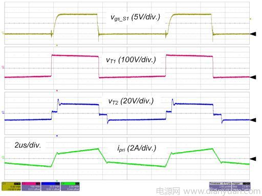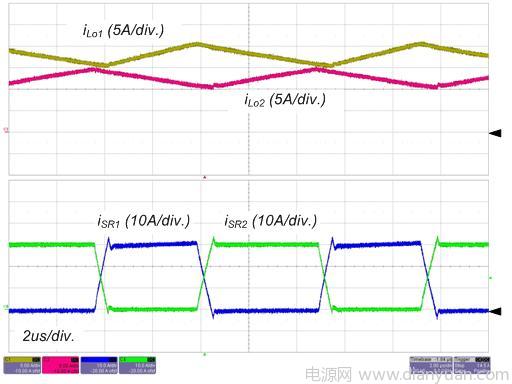 圖 4 和圖 5 所示為轉(zhuǎn)換器在標(biāo)稱(chēng)輸入和全負(fù)載情況下的實(shí)驗(yàn)波形。S1 的柵極信號(hào),主變壓器的初級(jí)端和次級(jí)端的電壓和初級(jí)端電流如圖4所示。請(qǐng)留意這些波形與理論分析很好地吻合,包括ZVS 運(yùn)作。輸出電感電流和 SR 的電流如圖 5 所示,由于占空比和寄生組件,輸出電感電流是不均衡的,這意味著平均勵(lì)磁電流小于中心抽頭式配置(注 1)。
