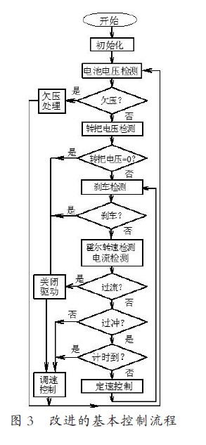 根據(jù)上述思路將軟件控制流程進(jìn)行修改。如圖3 所示。將“速度增大而電流不增”作為“過沖”的判斷依據(jù)??刂破鞒掷m(xù)檢測(cè)速度變化和電流變化,再經(jīng)過判斷,如果不屬于“過沖”的情況,則執(zhí)行子程序“調(diào)速控制”。這種情況下控制器檢測(cè)轉(zhuǎn)把電壓值來調(diào)整PWM,增大或減小電流值使速度變化直至達(dá)到操作者通過轉(zhuǎn)把設(shè)定的速度值。