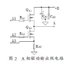 3)直流無刷電機(jī)的驅(qū)動(dòng)控制:參見圖1,此電路采用三相無刷直流電機(jī)。3 個(gè)霍爾位置傳感器的空間間距為120o,輸出信號(hào)a、b、c最終送給單片機(jī)作為轉(zhuǎn)子位置檢測(cè)信號(hào)及測(cè)速信號(hào)。其中A 相末級(jí)電路如圖2 所示,在驅(qū)動(dòng)電路中設(shè)置了電流檢測(cè)。單片機(jī)根據(jù)霍爾轉(zhuǎn)速信號(hào)和電流檢測(cè)信號(hào),經(jīng)過分析判斷,輸出正確的PWM 控制信號(hào)給相應(yīng)的線圈通電,從而控制電動(dòng)機(jī)的起動(dòng)、停止及轉(zhuǎn)速等。