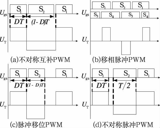 控制型軟開關(guān)半橋DC/DC變換器不增加主電路元器件(可增加電感電容元件以實(shí)現(xiàn)軟開關(guān)條件),通過合理設(shè)計(jì)控制電路來(lái)實(shí)現(xiàn)軟開關(guān)。圖1給出4種控制型軟開關(guān)半橋DC/DC變換器的PWM 控制策略。