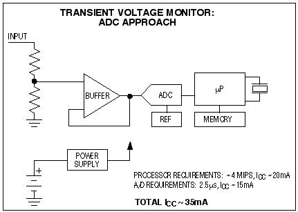 如果軟件比較具有高效編碼并且ADC無需處理器干預(yù),系統(tǒng)每次采樣可執(zhí)行少于10條指令,這就要求處理器具有4MIPS的能力。這種執(zhí)行能力并不適合采用電池供電(圖1)。需要考慮用模擬方法對輸入瞬態(tài)偏離進(jìn)行響應(yīng),用以替代連續(xù)跟蹤方案?! ?br />
