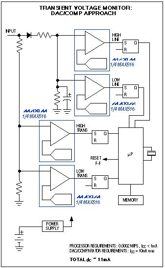在這種情況下,DAC/比較器替代方案提供了幾個明顯優(yōu)勢。需要4個DAC和4個比較器(或一片MAX516),后面連接一個4路設(shè)置/復(fù)位觸發(fā)器。一組DAC/比較器/FF監(jiān)測高瞬態(tài)電壓,一組監(jiān)測低瞬態(tài)電壓,一組用于監(jiān)測電網(wǎng)跌落,一組用于監(jiān)測浪涌(圖2)。瞬態(tài)電壓直接耦合到比較器,連接到電壓跌落和浪涌監(jiān)測比較器的輸入首先要進(jìn)行整流和濾波,以獲得電網(wǎng)電壓的平均值。可在軟件中調(diào)整到合適的rms.