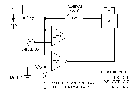 另外一種方法就是用一個低成本雙路DAC替代現(xiàn)有單路DAC.雙路DAC中的一路用于產(chǎn)生LCD對比度電壓,另一路用于構(gòu)成ADC.無論單路還是雙路,都需要DAC和比較器支持快速、驅(qū)動DAC的簡單程序,以及對比較器采樣來實現(xiàn)逐次逼近(參見sidebar,逐次逼近)。