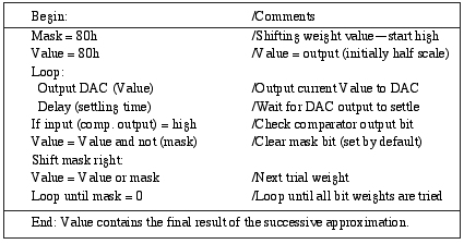 在逐次逼近ADC中,內(nèi)部DAC的位模擬系列二進(jìn)制重量,比較器輸出模擬天平指示。驅(qū)動權(quán)位處理的邏輯保存在封裝好的ADC的逐次逼近寄存器(SAR)或者控制DAC/比較器電路的處理器軟件子程序,該子程序可由不到20行的代碼來實現(xiàn)。