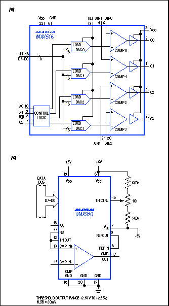 圖S1. Maxim 8位DAC/比較器IC包括4通道MAX516 (a)、高速、TTL兼容MAX910 (b)、以及ECL兼容MAX911(未列出)