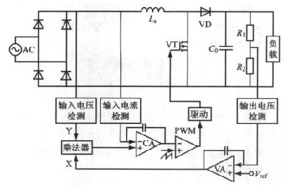 工作原理:APFC主電路的輸出電壓經(jīng)電阻分壓后與基準(zhǔn)電壓相比較,誤差值輸入到VA;VA 輸出信號X與輸入電壓檢測信號Y一起輸入乘法器,經(jīng)過平均化處理、放大、比較后,再經(jīng)過PWM 比較器加到柵極驅(qū)動(dòng)器,產(chǎn)生對開關(guān)管VT的控制信號,從而使電感Ls上的電流(即輸入電流)平均值始終跟蹤模擬乘法器輸出的半正弦信號,即跟蹤了輸入電壓波形,并實(shí)現(xiàn)了輸入電流正弦化,使功率因數(shù)接近1,達(dá)到校正功率因數(shù)的目的。