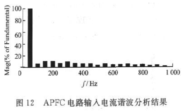 單相APFC電路采用Matlab7.6進(jìn)行建模與仿真。圖10為APFC電路輸入電壓和電流波形,可見網(wǎng)側(cè)輸入電流由窄脈沖波形變成正弦電流波形,且與輸入電壓同相位。圖11為APFC電路輸出電壓波形,可見經(jīng)過60ms的軟啟動(dòng)過程之后,輸出電壓穩(wěn)定在400V左右,滿足設(shè)計(jì)要求。圖12為APFC電路輸入電流諧波分析結(jié)果,可見除基波外,其余諧波含量均很小?! ?/p>