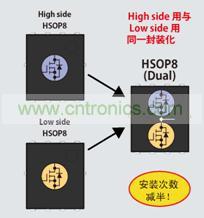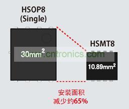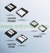 根據(jù)不同用途,提供3種小型封裝。HSMT8比HSOP8的安裝面積減少了65%,為節(jié)省空間做出巨大貢獻(xiàn)。而且,產(chǎn)品陣容中還包括DC/DC電源電路中的高邊(High Side)用MOSFET與低邊(Low Side)用MOSFET復(fù)合化的新封裝HSOP8(Dual)。不僅安裝面積減小,而且還可有助于減少安裝次數(shù)。