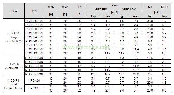 新系列產(chǎn)品,除了進(jìn)一步微細(xì)化,采用羅姆獨(dú)家的低容量構(gòu)造和新的“溝槽式場板結(jié)構(gòu)”,同時(shí)實(shí)現(xiàn)了低柵極容量與低導(dǎo)通電阻。作為DC/DC轉(zhuǎn)換器用功率MOSFET的性能指數(shù)所使用的“FOM”與傳統(tǒng)產(chǎn)品相比降低了50%,達(dá)到了業(yè)界頂級的高效性。由此,不僅降低了同期整流型DC/DC電源電路的高邊(High Side)的開關(guān)損耗,而且降低了低邊(Low Side)的導(dǎo)通損耗,可大大提高電路整體的效率。另外,能夠在高頻下進(jìn)行同期整流動作,使外圍部件的小型化成為可能。此外,本產(chǎn)品為了確保在同期整流電路中的性能,針對Rg(柵極電阻)、UIS(L負(fù)載雪崩耐量)實(shí)施了100%試驗(yàn),在質(zhì)量方面也具有高可靠性。羅姆今后也將充分發(fā)揮獨(dú)創(chuàng)的先進(jìn)工藝加工技術(shù),不斷推進(jìn)設(shè)想到客戶需求的晶體管產(chǎn)品的開發(fā)。