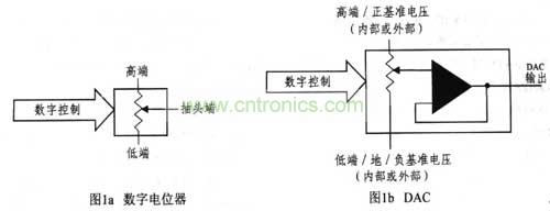 利用數(shù)字輸入控制微調(diào)模擬輸出有兩種選擇:數(shù)字電位器和數(shù)/模轉(zhuǎn)換器(DAC),兩者均采用數(shù)字輸入控制模擬輸出。通過數(shù)字電位器可以調(diào)整模擬電壓;通過DAC既可以調(diào)整電流,也可以調(diào)整電壓。電位器有三個模擬連接端:高端、抽頭端(或模擬輸出)和低端(見圖1a)。DAC具有隊應的三個端點:高端對應于正基準電壓,抽頭端對應于DAC輸出,低端則可能對應于接地端或負基準電壓端(見圖1b)。