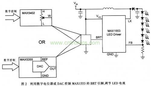 但在當前的許多應用中,DAC與數(shù)字電位器之間選擇的界限比較模糊,圖2中的DAC和數(shù)字電位器都可用于控制MAXl553 LED驅(qū)動器。MAXll53亮度(BRT)輸入的直流電壓和檢流電阻決定了LED的電流。