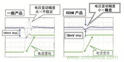 參見表1?;旧?,兩種產(chǎn)品都是高效同步整流的降壓型控制器,不僅在重負(fù)載時(shí)的效率高,輕負(fù)載時(shí)的效率也很高。標(biāo)準(zhǔn)電壓為0.75V/0.7V,適用低電壓,±1%的精度對于前述的±3%的精度來說具有充分的余量。不僅如此,通過ROHM獨(dú)創(chuàng)的H3RegTM控制模式實(shí)現(xiàn)了高速負(fù)載瞬態(tài)響應(yīng)(圖4),非常適合用作FPGA電源。