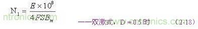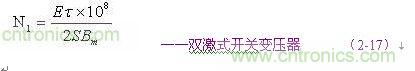 (2-17)和(2-18)式,為計(jì)算雙激式開(kāi)關(guān)變壓器初級(jí)線圈N1繞組匝數(shù)的公式。式中,N1為變壓器初級(jí)線圈N1繞組的最少匝數(shù),S為變壓器鐵芯的導(dǎo)磁面積(單位:平方厘米),Bm為變壓器鐵芯的最大磁感應(yīng)強(qiáng)度(單位:高斯),τ為脈沖寬度,或電源開(kāi)關(guān)管的導(dǎo)通時(shí)間(單位:秒),E為脈沖電壓的幅度,單位為伏,F(xiàn)為開(kāi)關(guān)電源的工作頻率,單位赫芝。
