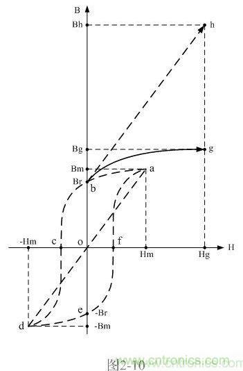 在圖2-10中,虛線表示的磁化曲線a-b-c-d-e-f-a為雙激開(kāi)關(guān)變壓器鐵芯正常工作時(shí)的磁滯回線,虛線線段d-a是把開(kāi)關(guān)變壓器鐵芯的磁化曲線理想化后得到的一條曲線(直線),理想磁化曲線是一條斜率等于最大磁感應(yīng)強(qiáng)度增量與最大磁場(chǎng)強(qiáng)度增量之比,且經(jīng)過(guò)坐標(biāo)原點(diǎn)的直線;當(dāng)直線不經(jīng)過(guò)坐標(biāo)原點(diǎn)時(shí),這條直線可稱為等效磁化曲線(如線段bh)。理想磁化曲線只有一條,但等效磁化曲線卻有無(wú)數(shù)多條,且每條效磁化曲線均與理想磁化曲線平行。