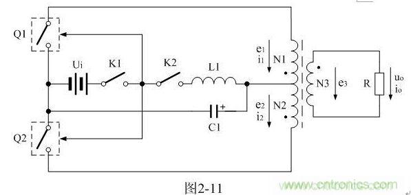 在圖2-11中,開(kāi)機(jī)時(shí),驅(qū)動(dòng)電路電源開(kāi)關(guān)K1首先接通,電源Ui首先給電源開(kāi)關(guān)管Q1、Q2的驅(qū)動(dòng)電路加電;然后開(kāi)關(guān)管電源開(kāi)關(guān)K2接通,由于L1的作用,C1兩端的電壓只能緩慢上升,以保證加到變壓器初級(jí)線圈的電壓不會(huì)突然升高,使流過(guò)變壓器初級(jí)線圈的電流過(guò)大,導(dǎo)致變壓器鐵芯出現(xiàn)飽和;關(guān)機(jī)時(shí),開(kāi)關(guān)管電源開(kāi)關(guān)K2首先關(guān)斷,而后驅(qū)動(dòng)電路電源開(kāi)關(guān)K1再關(guān)斷,由于C1兩端的電壓緩慢下降,使變壓器鐵芯可進(jìn)行充分退磁,以保證下次開(kāi)機(jī)的時(shí)候,變壓器鐵芯磁滯回線的初始相位總是從0開(kāi)始。