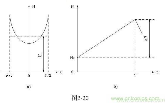 圖2-20-a和圖2-20-b分別是由(2-56)式給出的,鐵芯片中磁場強(qiáng)度按水平方向分布的函數(shù)H(x)和按時(shí)間分布的函數(shù)H(t)曲線圖。