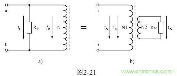 圖2-21-b是更形象地把渦流損耗等效成一個(gè)變壓器次級線圈N2給損耗電阻Rb2提供能量輸出,流過變壓器次級線圈N2的電流
