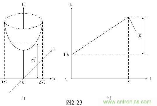 上面(2-65)式是表示圓柱體鐵芯截面沿x軸方向的磁場分布圖。其實(shí)磁場分布在整個(gè)鐵芯截面的xy平面內(nèi)都是以中心對稱的。這樣圓柱形變壓器鐵芯中的磁場強(qiáng)度在xy平面的分布函數(shù)H(x,y)曲面,就相當(dāng)于把圖2-20-a的函數(shù)曲線,以中心為圓心旋轉(zhuǎn)一周而得到的新圖形。