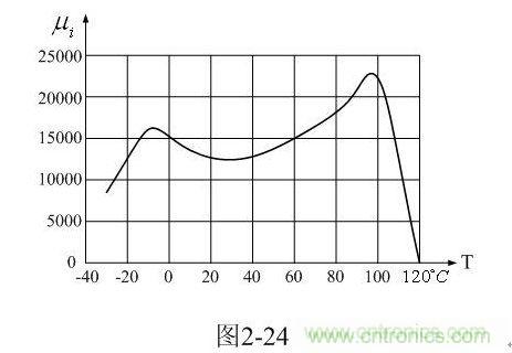 順便說明,圖2-24中的初始導(dǎo)磁率 一般是用磁環(huán)作為樣品測試得到的,測試信號的頻率一般比較低,僅為10kHz,并且測試時(shí)一般都選用最大導(dǎo)磁率作為結(jié)果;因此,實(shí)際應(yīng)用中的開關(guān)變壓器鐵芯的導(dǎo)磁率并沒有這么高。