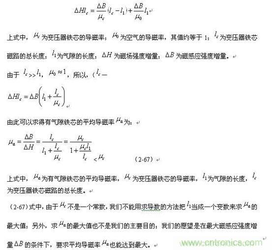 最大值的條件;當(dāng)然是氣隙長度越小,平均導(dǎo)磁率 就越大。但在實(shí)際工作中, 的值要小于此值,因?yàn)椋瑢庀堕L度要預(yù)留一定的余量,變壓器鐵芯的工作點(diǎn)不可能讓永遠(yuǎn)工作在最佳值的邊沿;因此,實(shí)際工作中的變壓器鐵芯,其最大磁感應(yīng)強(qiáng)度增量和最大磁場強(qiáng)度增量都會超出(2-68)式給出條件的范圍;所以,由(2-68)式求出的氣隙長度 也是最低極限值。
