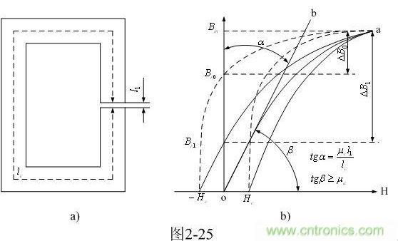 我們再來看圖2-25-b。在圖2-25-b中,虛線表示變壓器鐵芯沒有氣隙時(shí)的磁滯回線,實(shí)線表示變壓器鐵芯留有氣隙時(shí)的磁滯回線,其中磁化曲線o-a為留有氣隙鐵芯的基本磁化曲線。這里的基本磁化曲線與初始磁化曲線并不完全相同,這里的基本磁化曲線相當(dāng)于磁化曲線的幾何平均值,以便用于分析磁場強(qiáng)度增量與磁感應(yīng)密度增量,?B 的關(guān)系。